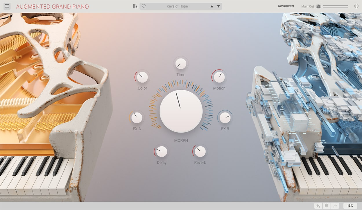 Mas o Augmented GRAND PIANO não é apenas uma coleção de sons pré-fabricados. Ele também permite que você customize e interaja com o som do piano de forma criativa e inspiradora. Você pode usar o poderoso controle Morph para mover-se entre as duas camadas de som, cada uma com duas fontes de som, que podem ser amostras ou síntese.