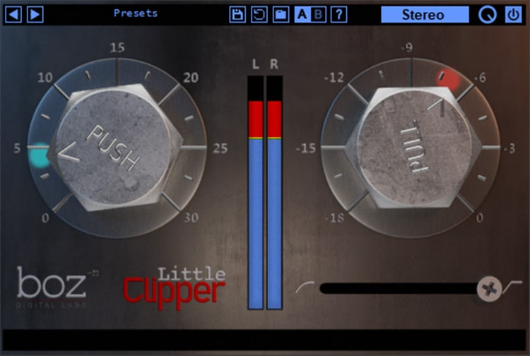 Qualquer coisa acima do threshold é cortada, qualquer coisa abaixo é intocada. Um controle deslizante Hard / Soft permite moldar o clipping de suave e suave a brilhante. Entre os botões Push e Pull estão os medidores que mostram o nível de entrada e o threshold. Os níveis são exibidos em azul, enquanto a quantidade de clipping é mostrada acima do nível de entrada em vermelho.