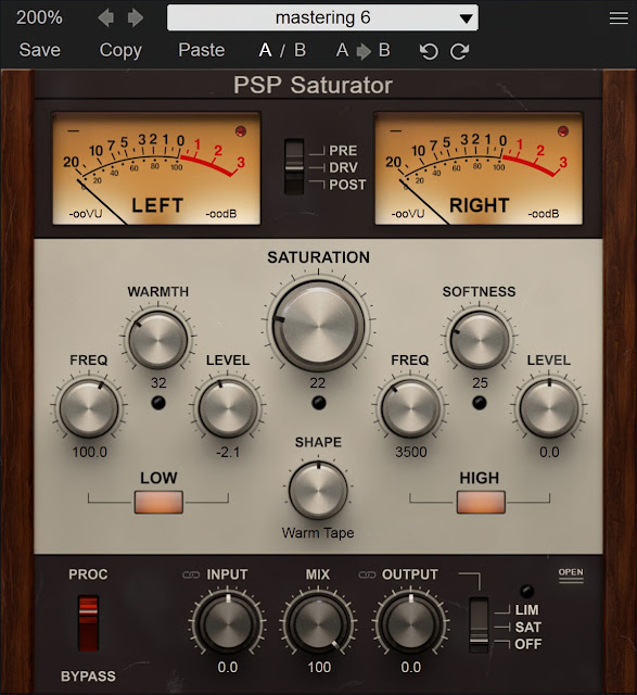 PSP Saturator emula a maneira como dispositivos analógicos, como gravadores de fita e circuitos de válvula, aquecem e “saturam” seu material de áudio. Isso é obtido pela adição de harmônicos, filtragem dedicada e processamento dinâmico. O PSP Saturator usa três algoritmos para emular esses dispositivos e oferece oito modos de forma diferentes para cargas de flexibilidade de 'mix mojo' sutil a destruição total de áudio.